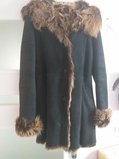 Śliczny, ciepły, przytulny i naturalny kożuch polskiego producenta z obszyciem z lisa, kapturem i paskiem. Rozmiar " L ...